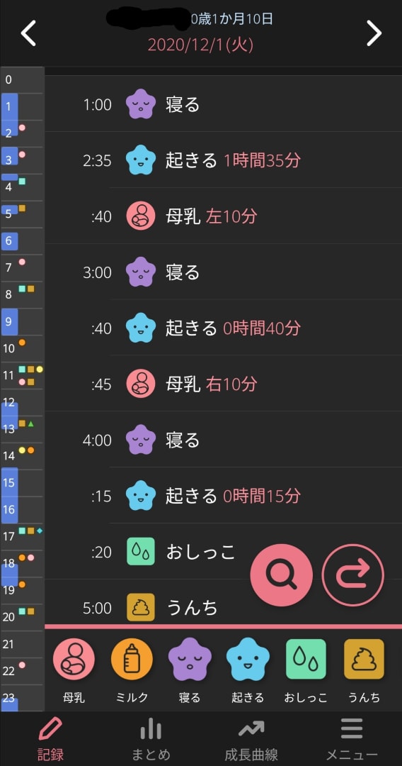 我が家ではぴよログというアプリで育児記録を行っています。このアプリでは食事や睡眠、排泄をはじめとした様々なアクションを記録できます。