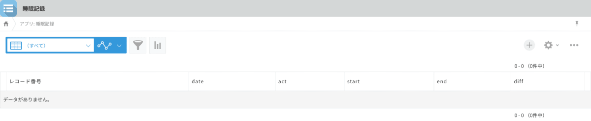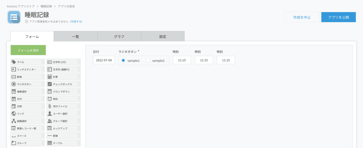 kintoneではドラッグ&ドロップでアプリの作成が行なうことができます。管理したい項目を任意の形で並べます。今回は日別の就寝・起床時間を管理したいので、このような項目を用意します。