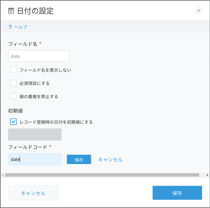 - 各項目の設定を変更します。各項目にオンマウスすると⚙のマークが表示されるので、設定をクリックします。フィールド名・フィールドコードを上表の項目名に変更します。