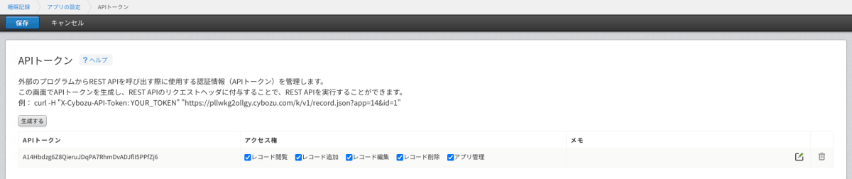 APIトークン生成画面が表示されます。「生成する」ボタンをクリックするとトークンおよびアクセス権が表示されます。アクセス権はいったん全権を与えておき、左上の「保存」ボタンをクリックします。