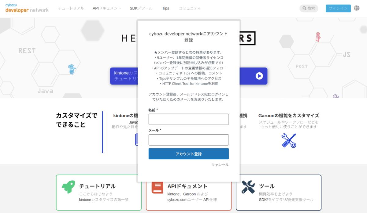 cybozu.com 上のサービスに関してサイボウズ株式会社(以下、「サイボウズ」と言います)が提供するデベロッパー向けのサービスで、デベロッパー向けのAPIドキュメント、サンプルプログラム、各種Tips等の情報や、デベロッパー同士が課題を解決し合うためのオープンなコミュニティを用意しています。 ー 「利用規約」より