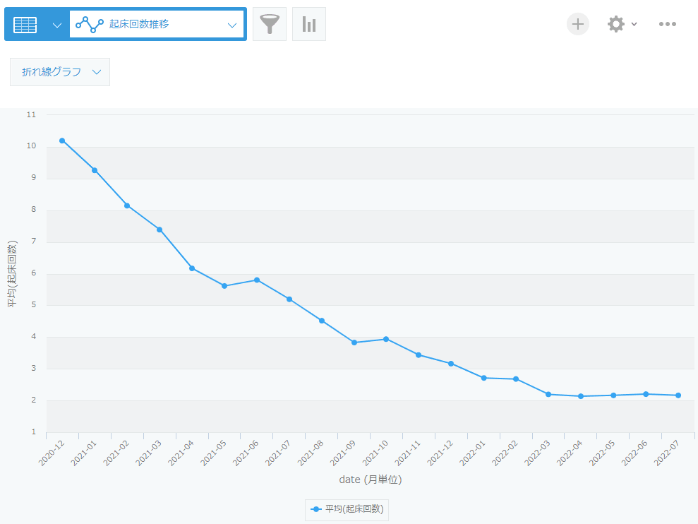 「睡眠時間(合計)」、「起床回数」の月別推移も同様に作成します。集計方法の項目を変更するだけです。