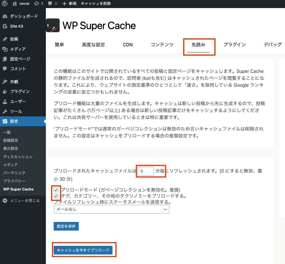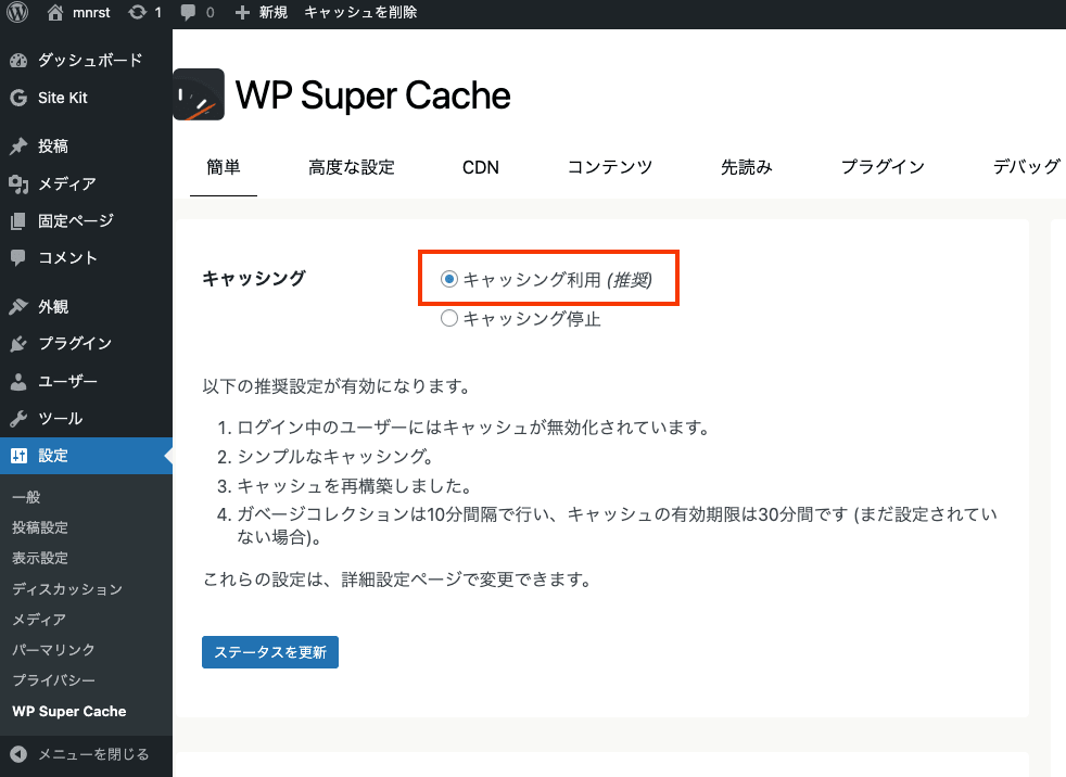「ログイン中のユーザーに対してはキャッシュを無効化する。」になっていることを確認します。