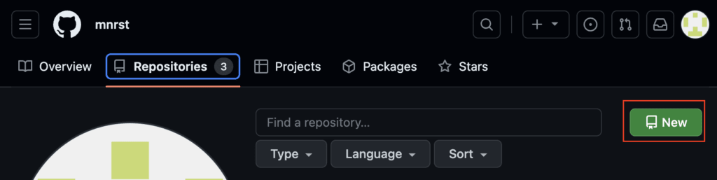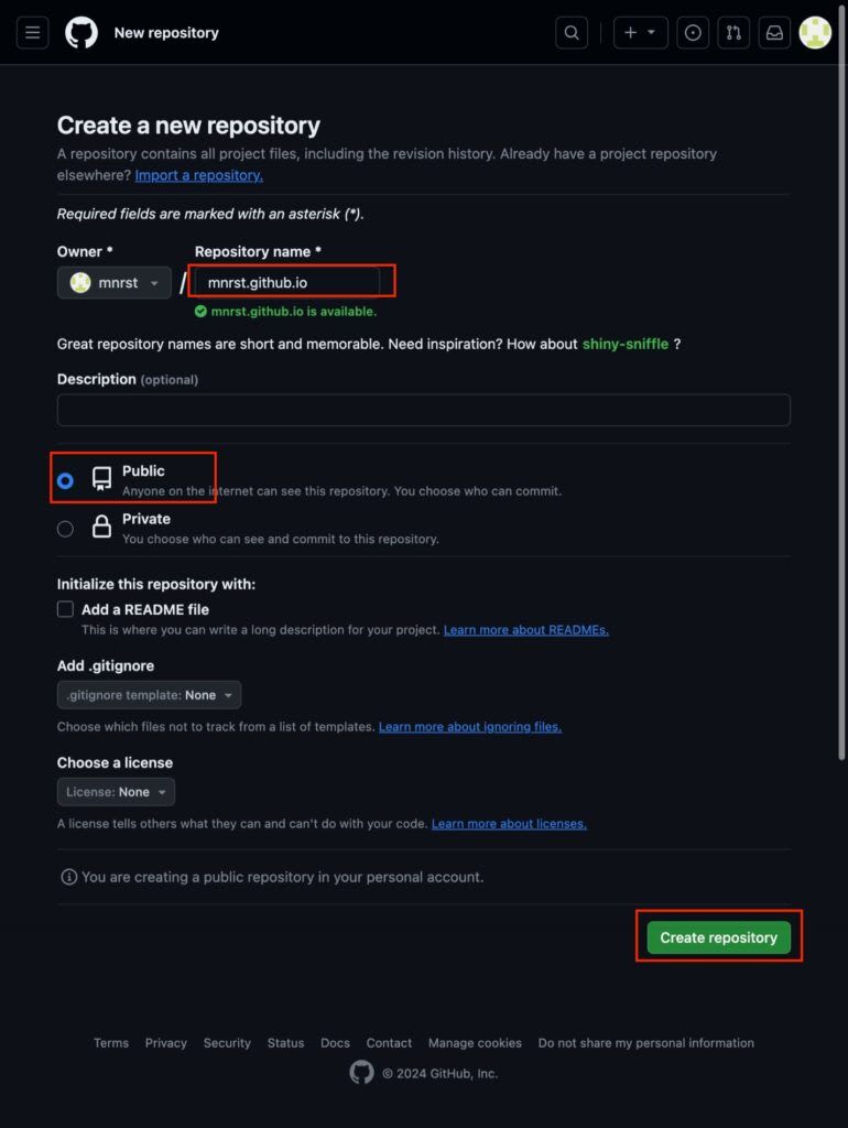 自分の場合はアカウント名が mnrst なので mnrst.github.io というリポジトリを Public で作成します。