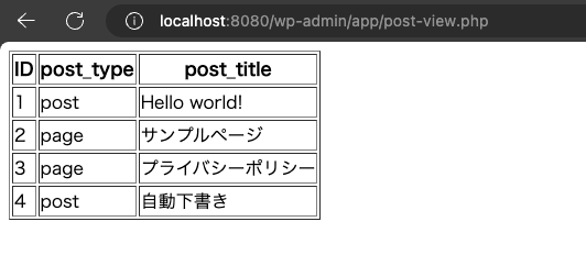 phpMyAdmin とか WordPress のプラグインとか、もしくは MySQL に直接アクセスできるならこんな事はしなくても良いと思います。しかしながら例えば、頻繁に管理者ユーザーだけが毎回、特定の条件で一覧情報を取得したい場合などは、管理者ユーザー用の PHP を用意しておけば簡単で便利ではないでしょうか。という事で、WordPress 内に wp_posts テーブルの情報を表示する PHP を作ってみました。