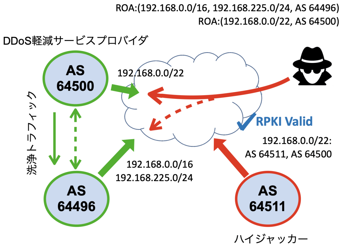 RPKIを導入する前に、次のシナリオを考えてみる。AS 64496が192.168.0.0/16をアナウンスし、AS 64500を保持するDDoS軽減サービス・プロバイダと契約しているとする。さらに、DDoS軽減サービス契約は 192.168.0.0/22でカバーされるすべてのIPアドレスに適用されると仮定する。DDoS攻撃が検出され、AS 64496によって報告されると、AS 64500は直ちに192.168.0.0/22を発信し、すべてのDDoSトラフィックを自身のAS 64500に引き付ける。トラフィックはAS 64500で洗浄され、バックホール・リンクを経由して、AS 64496に送り返される。DDoS攻撃中、DDoS軽減サービス・プロバイダAS 64500は、AS 64496の/16プレフィックスよりも長い/22プレフィックスを発信するため、通常AS 64496に送信されるすべてのトラフィック (192.168.0.0/22のアドレス宛て)が、代わりにAS 64500に送られることに注意する。いくつかの展開では、/22経路の発信はAS 64496によって実行され、AS 64500にのみアナウンスされ、AS 64500はそのプレフィックスのトランジットをアナウンスする。このバリエーションは、ここで考慮される特性を変えるものではない。
