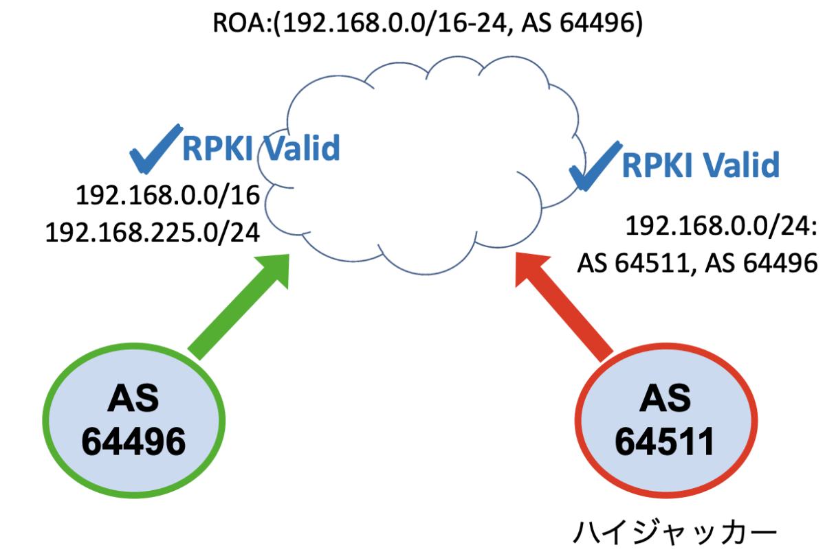 ROA (192.168.0.0/16-24, AS 64496)は、AS 64496が192.168.0.0/24のBGP経路を発信すること認可しているため、ハイジャッカーのBGPアナウンスはRPKIに従って有効である。