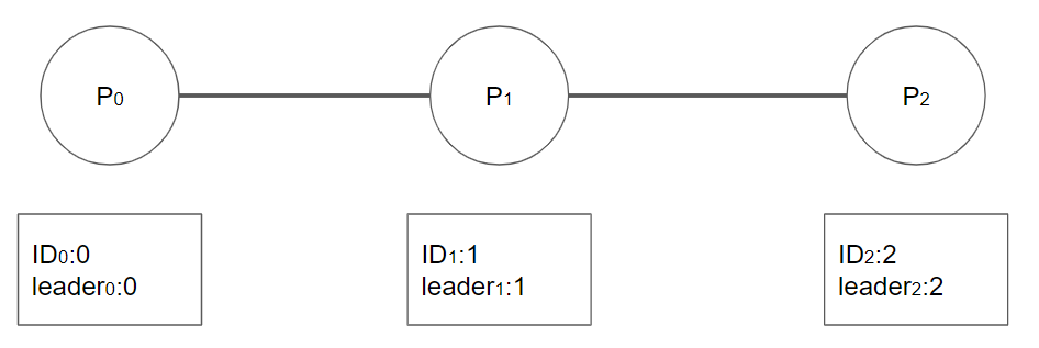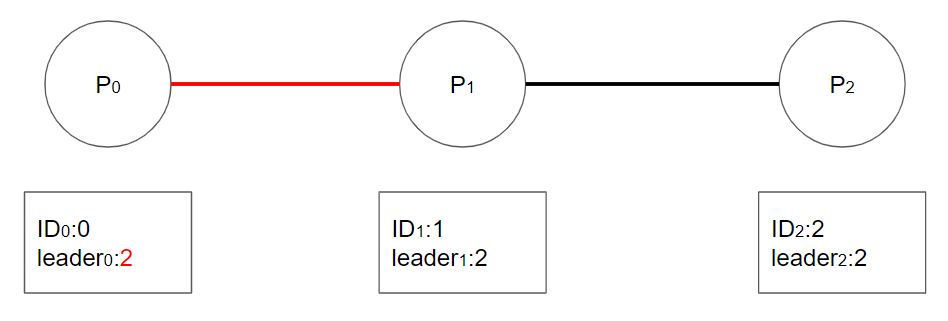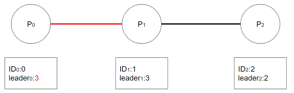 P0はP1の「leader」の値と自分の「leader」の値を比較することによって、