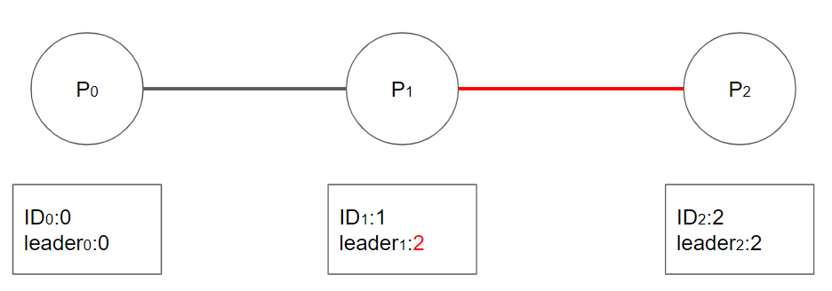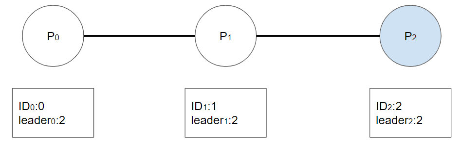 P1とP2が通信し、P1の「leader」の値が「2」に更新されます。