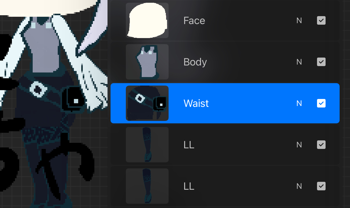 ここでいうと腰パーツで足の根本を隠してる。