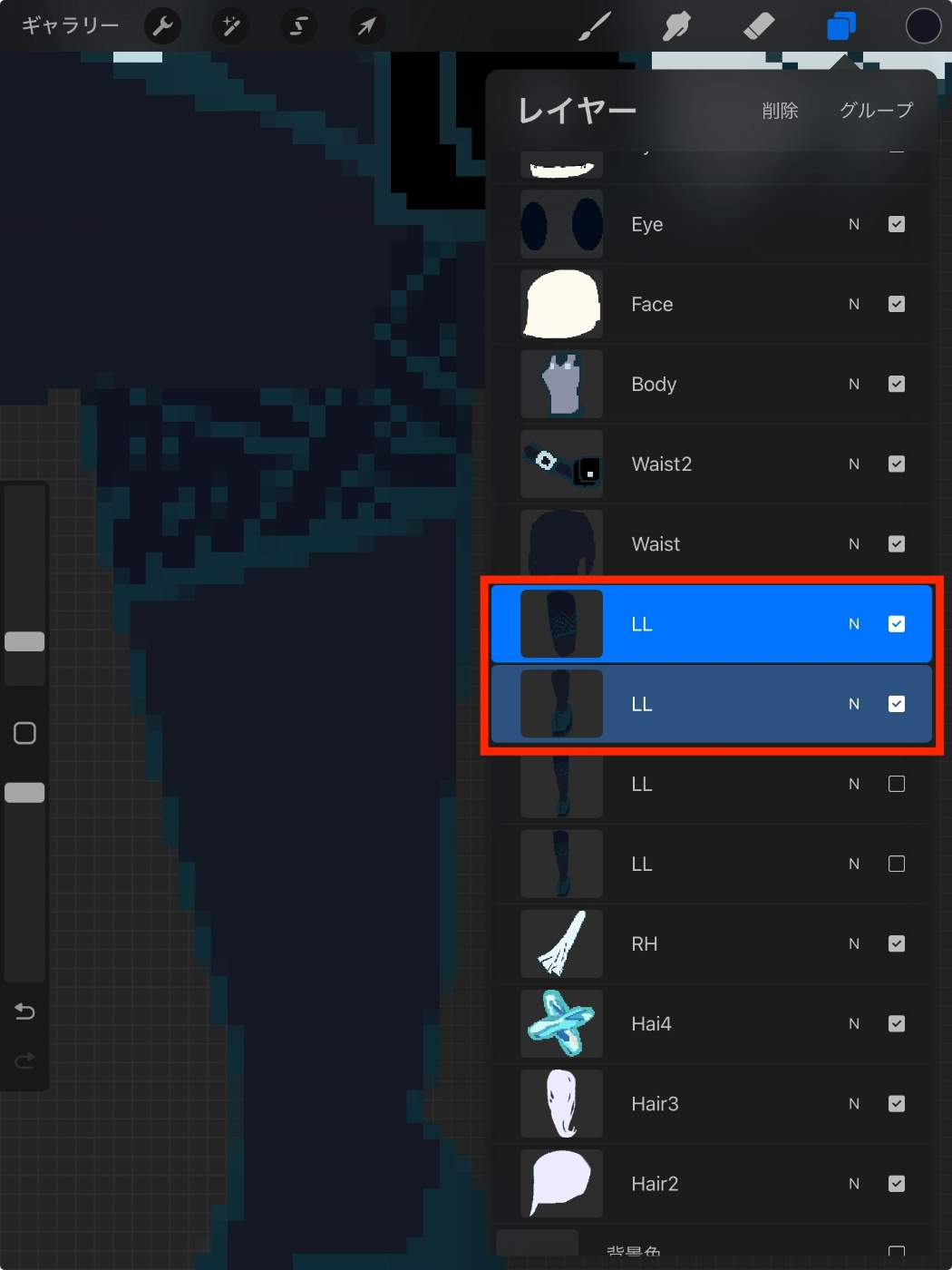 キャラクターを描くパーツに分けてレイヤーを作成します。