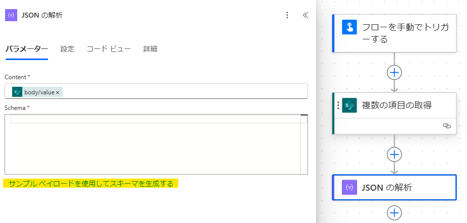 手順1のデータ取得と手順2のCSVテーブル作成の間に、アクション「JSONの解析」を入れる方法を紹介している記事もありました。「JSONの解析」を行う目的は、JSONからのValueの抽出と思われますが、手順2の段階で、すでに動的コンテンツとして、Valueが使用できる場合、「JSONの解析」は不要と考えられます。参考として、JSON解析の使い方を解説します。