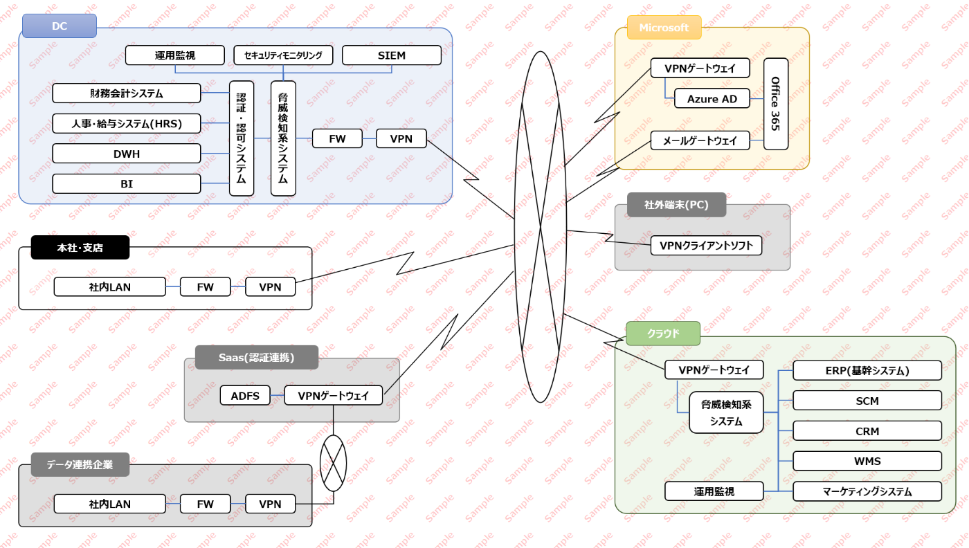 各システム群とセキュリティ機器の構成にフォーカスを置いて俯瞰図を想定してみました。