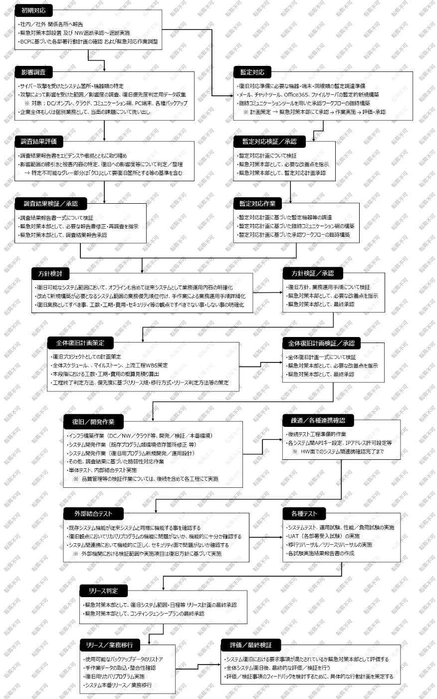 今回のようなケースでの復旧対応業務のフローを検討したところ、想像以上に作業内容はハードだと感じました。中小企業は別としても、上場企業の場合は各段階で承認ステップが必要になる想定のため、工数・工期が必要となるのは必然的と言えます。