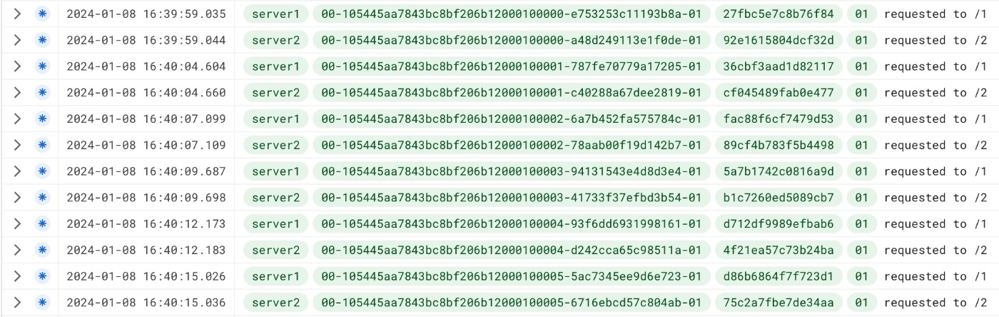 /1のtraceparentのtrace_flagsは00ですが、OTelが付与したフラグは01と差分が出ました。/2は差分なしです。