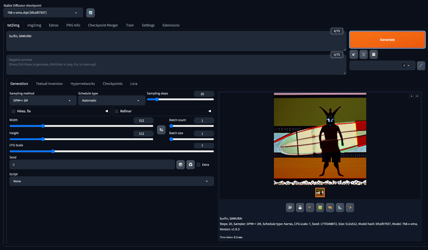 プロンプトを入力して、Generate を押すと画像が生成されました 🫡