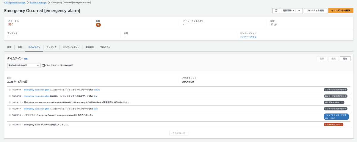 以下はアラーム発生から約10分後のタイムラインです。太郎→次郎→三郎の順に5分間隔でエスカレーションされていることが確認できます。