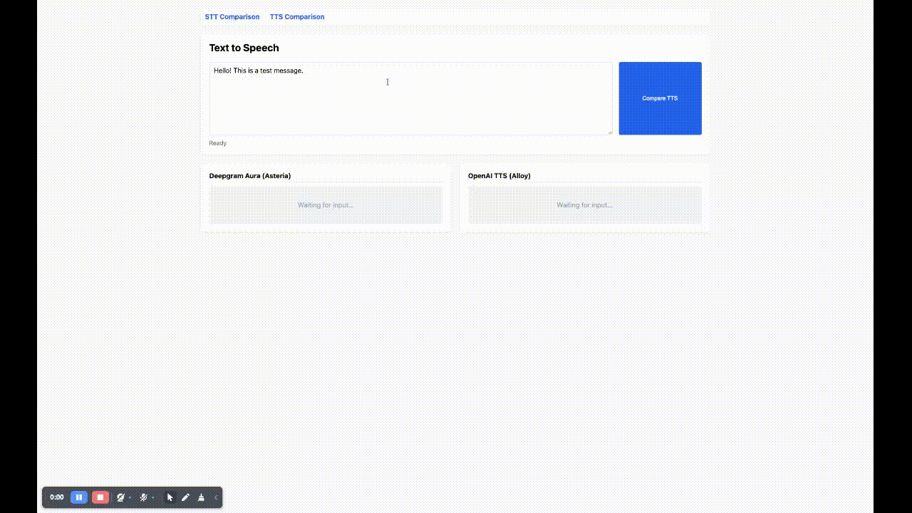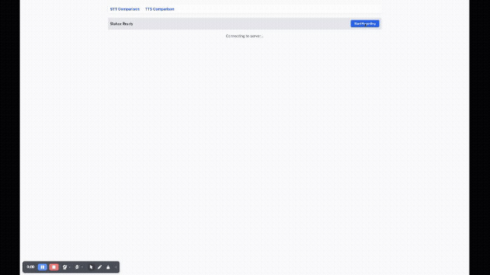 次はSTTの比較画面です。比較したいモデルを登録しておくとこのようにマイクで喋ると、その書き起こし結果とレスポンス速度が表示されます。