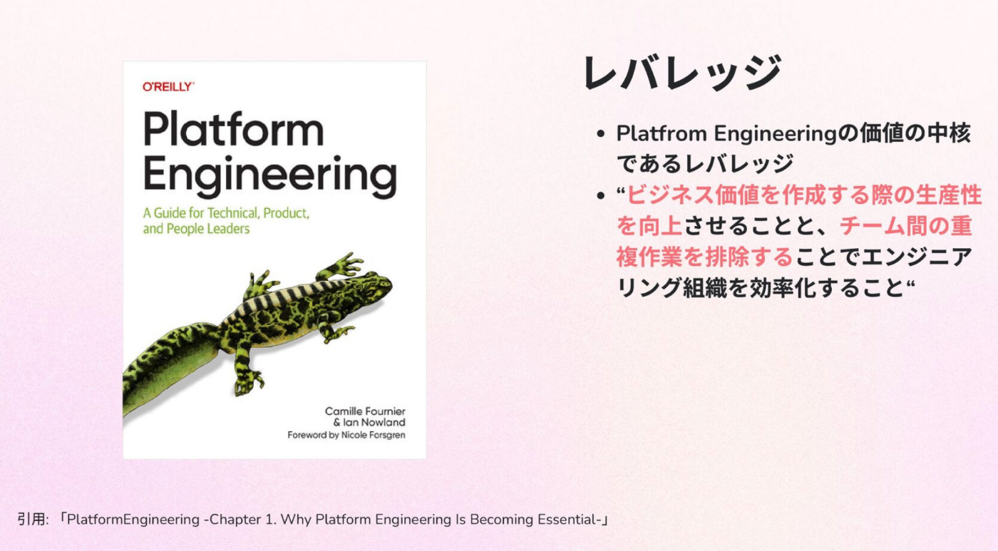 Platform Engineeringの価値は「レバレッジ」にあります。基盤チームの活動がテコの原理のように作用し、組織全体の生産性を大きく引き上げることを目指しています。