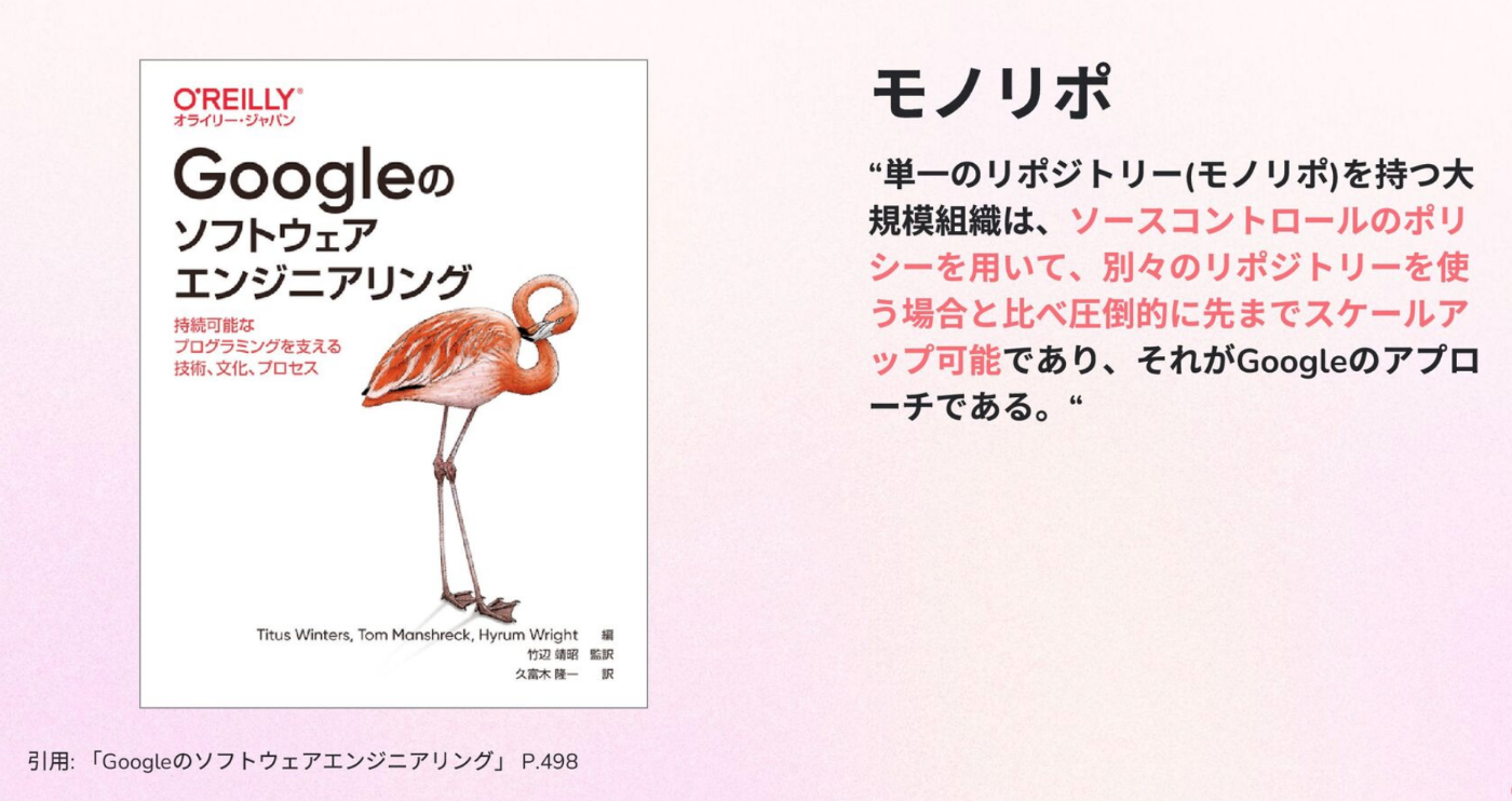 書籍Googleのソフトウェアエンジニアリングでも、大規模組織におけるモノレポの優位性について以下のように述べられています。