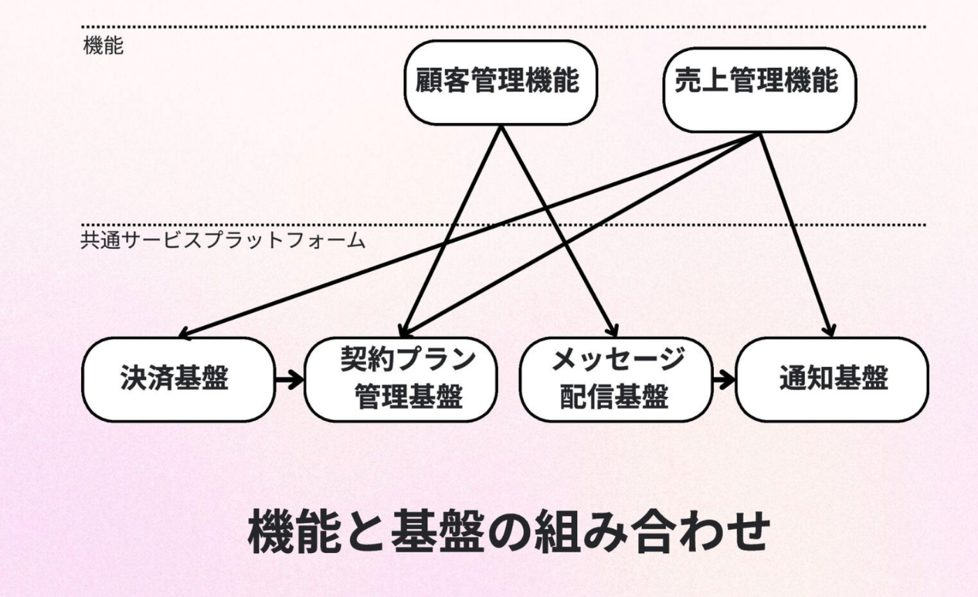 具体的には、決済、通知、メッセージ配信、アカウント管理など、どのプロダクトにも必要不可欠な機能群を指します。