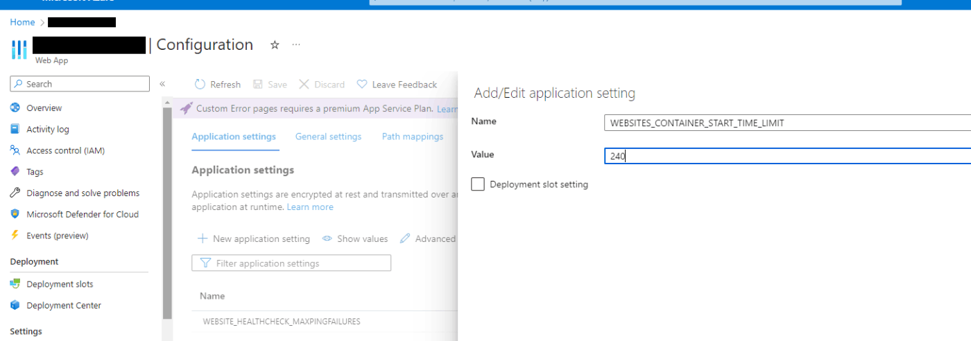 これは、Web App の Application settings に新規で WEBSITES_CONTAINER_START_TIME_LIMIT という環境変数を追加することで解決しました。