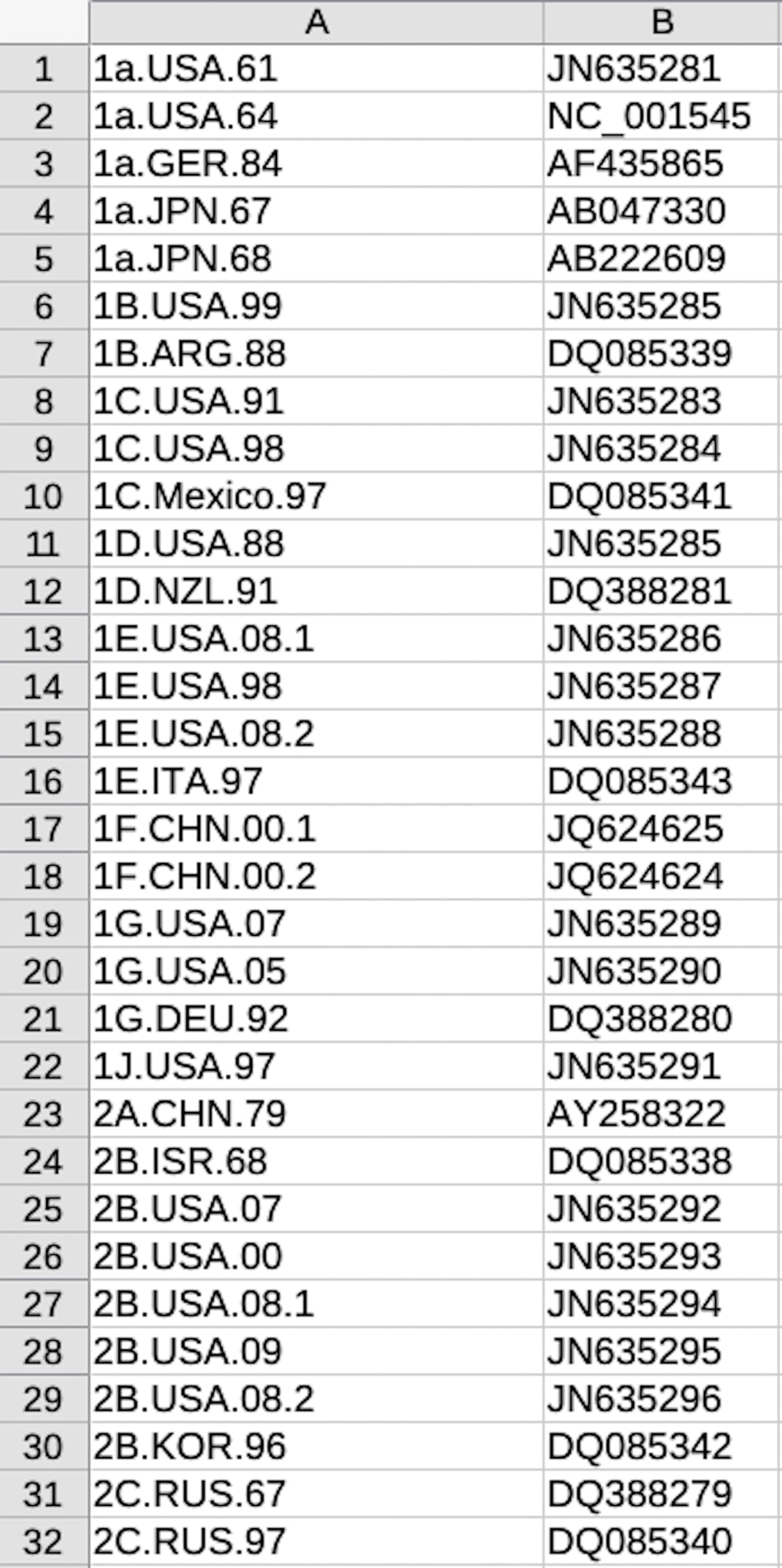 こちらの文献中のSupplemental Table 2にある32株の風疹ウイルスの配列データを使用します。