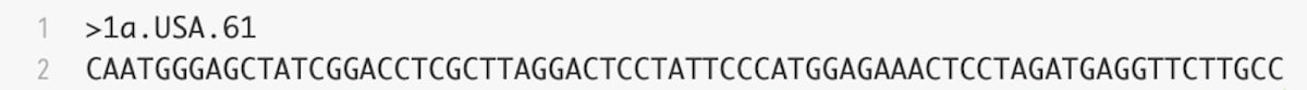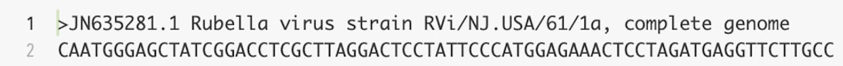 風疹ウイルスのComplete Genomeのサイズは約10Kbpなので、fastaファイルのサイズもおおよそ10KBです。