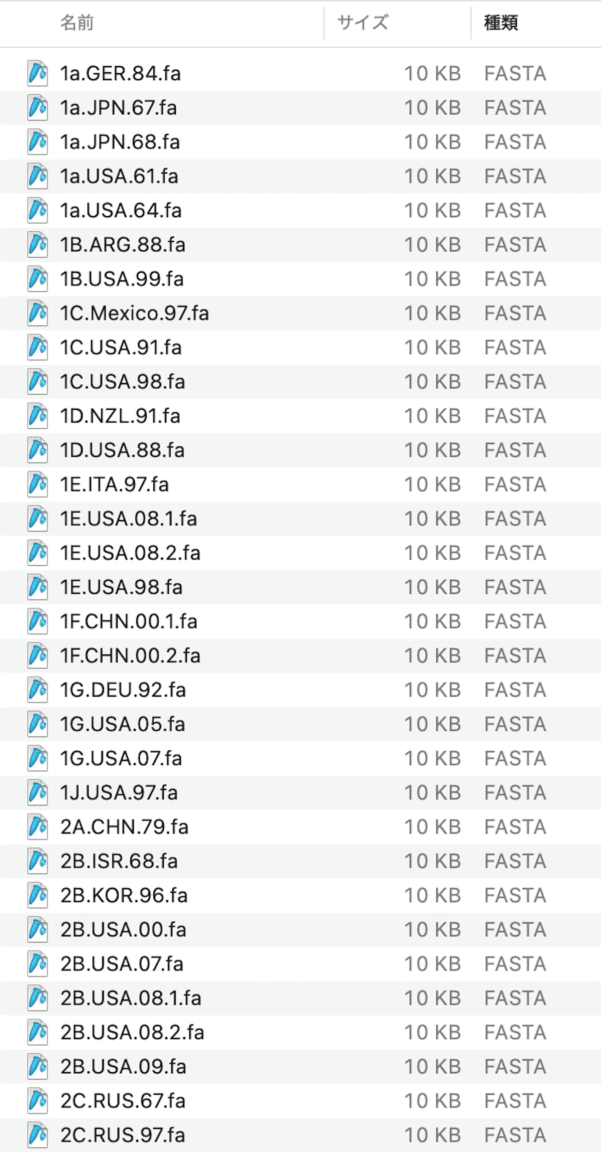 ダウンロードする際のファイル名を「Genotype.国.年」に揃えました(この形式で名前が重複する株には末尾に'.1''.2'を付加しました)。