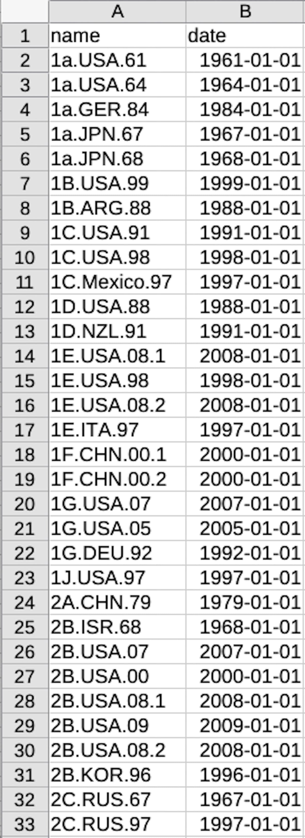 1列目に列名を「name」として株名を記載して(fastaファイルのヘッダ行に記載の内容と揃える)、2列目に列名を「date」として株の分離年月日を記載します。