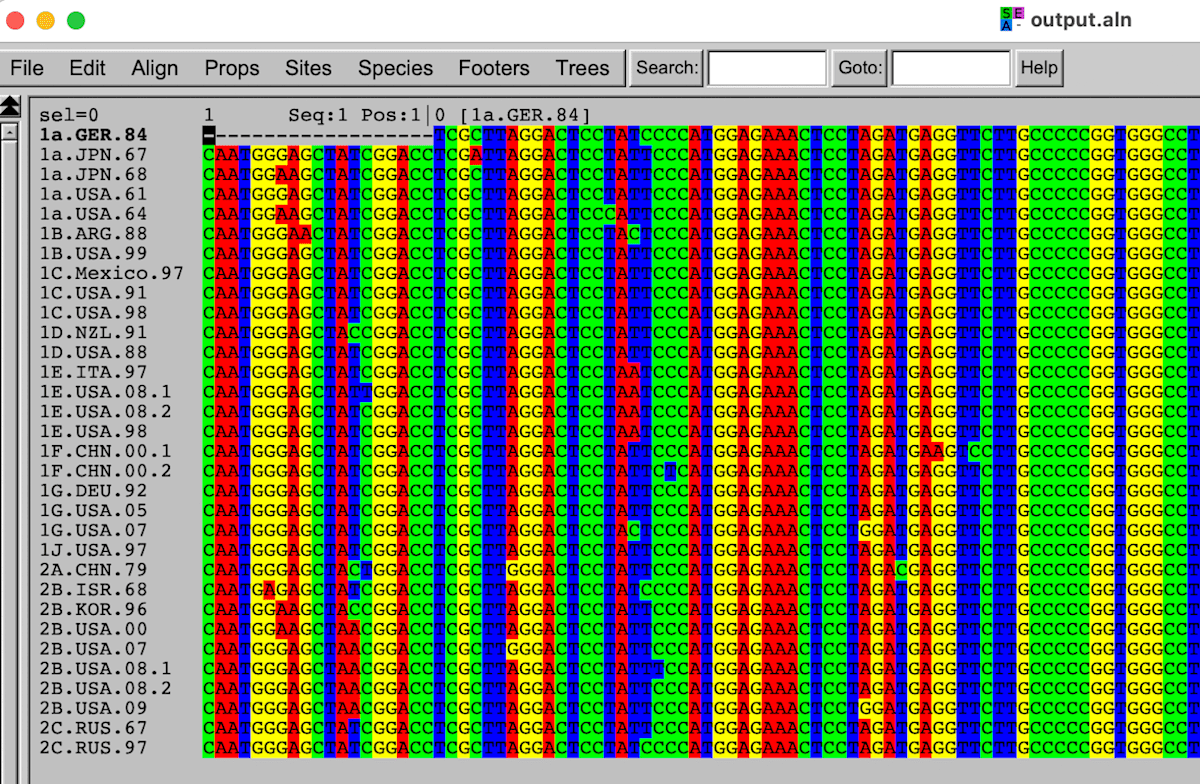 マルチプルアライメントの出力ファイル(output.aln)はmulti-fasta形式のファイルで、seaviewのようなプログラムで開いてアライメント結果を確認できます。