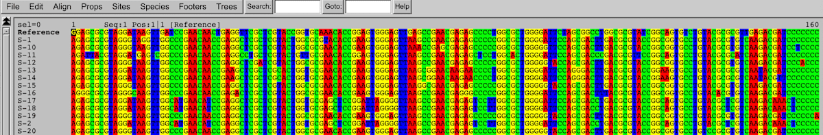 アライメント結果ファイルはmulti-fasta形式のファイルになっており、seaviewのようなプログラムで開くと、今回使う例ではこのような感じです。