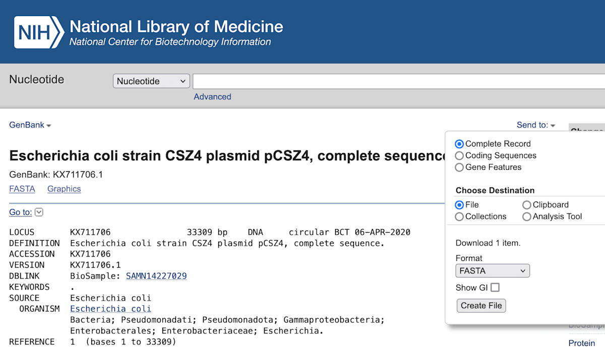 - CLIを使わずに1ファイルずつ、直接NCBIのサイトにアクセスしてWebからファイルをダウンロードすることも可能です(画面右にある「Send to:」のメニューより)。