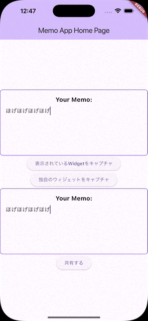 captureFromWidgetメソッドは、実際に UI に表示されていない Widget もキャプチャできる機能です。このメソッドは、指定された Widget を一時的にメモリ上でレンダリングし、そのイメージを取得します。これにより、現在の画面状態に依存せずに、画像を生成することができます。