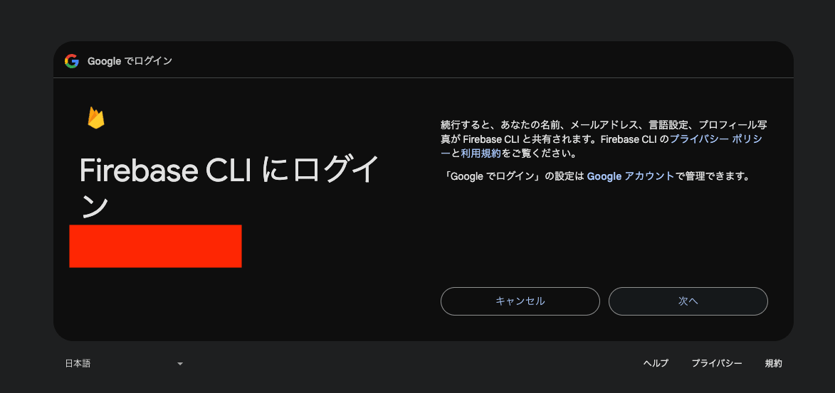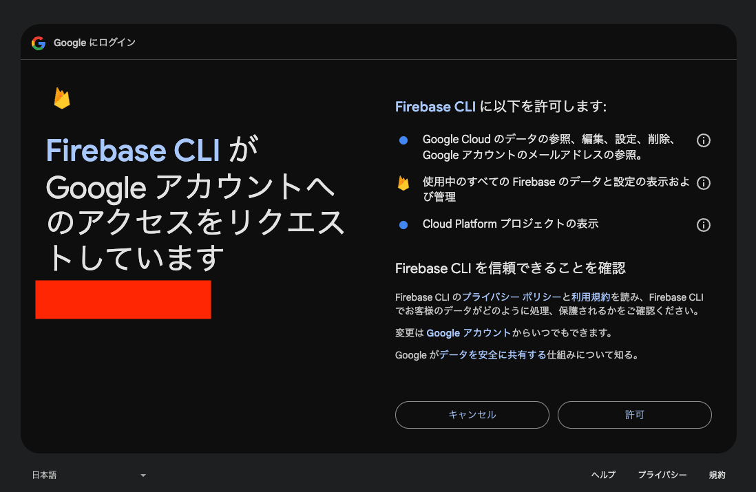 Yes と回答し、ブラウザで Firebase への CLI でのアクセスを許可します。