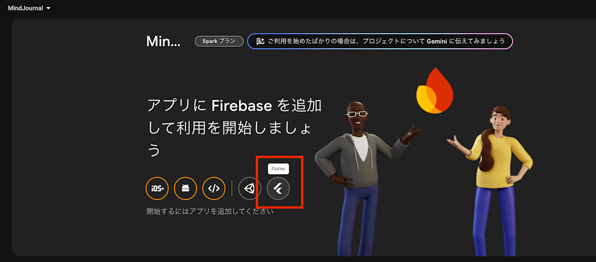 今回は Flutter で作成するため、Flutter アイコンを押下