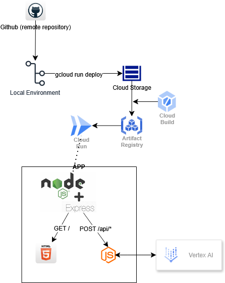 ブラウザからルートパスにGETリクエストすればSPAが立ち上がり、投稿を実施するなどの操作を行うとPOSTリクエストが走り、生成AIを使う場合はVertexAIのモデル利用APIを裏でたたいています。