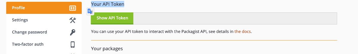 profileに show API Token ボタンがあるので押下後、トークンをコピーする