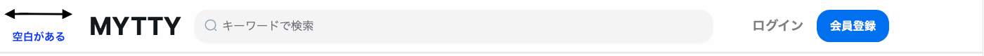 簡単なレイアウトを作成する際に、ブランド名と会員登録ボタンを両端に配置したかったのですが、Navbar コンポーネントでは、意図しないスタイルがデフォルトであたっていたためそのまま使用すると、以下のように両端に空白ができていました。