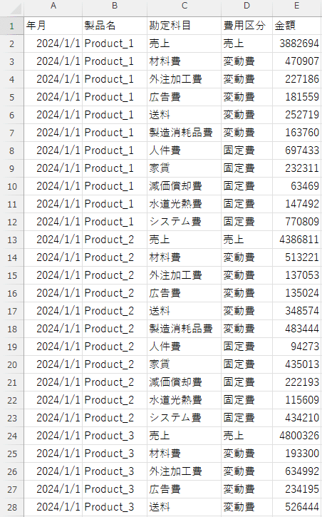 会計データを想定しているため、勘定科目ごとに1行が存在する縦持ちデータです。