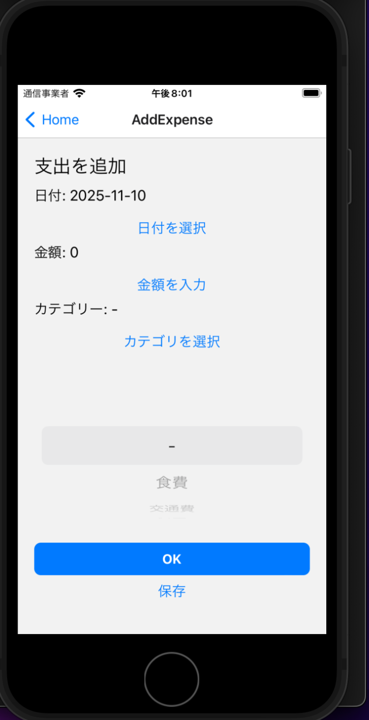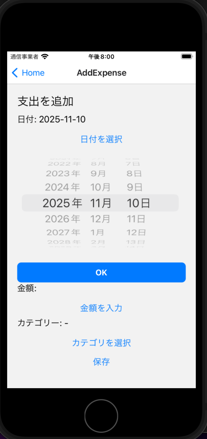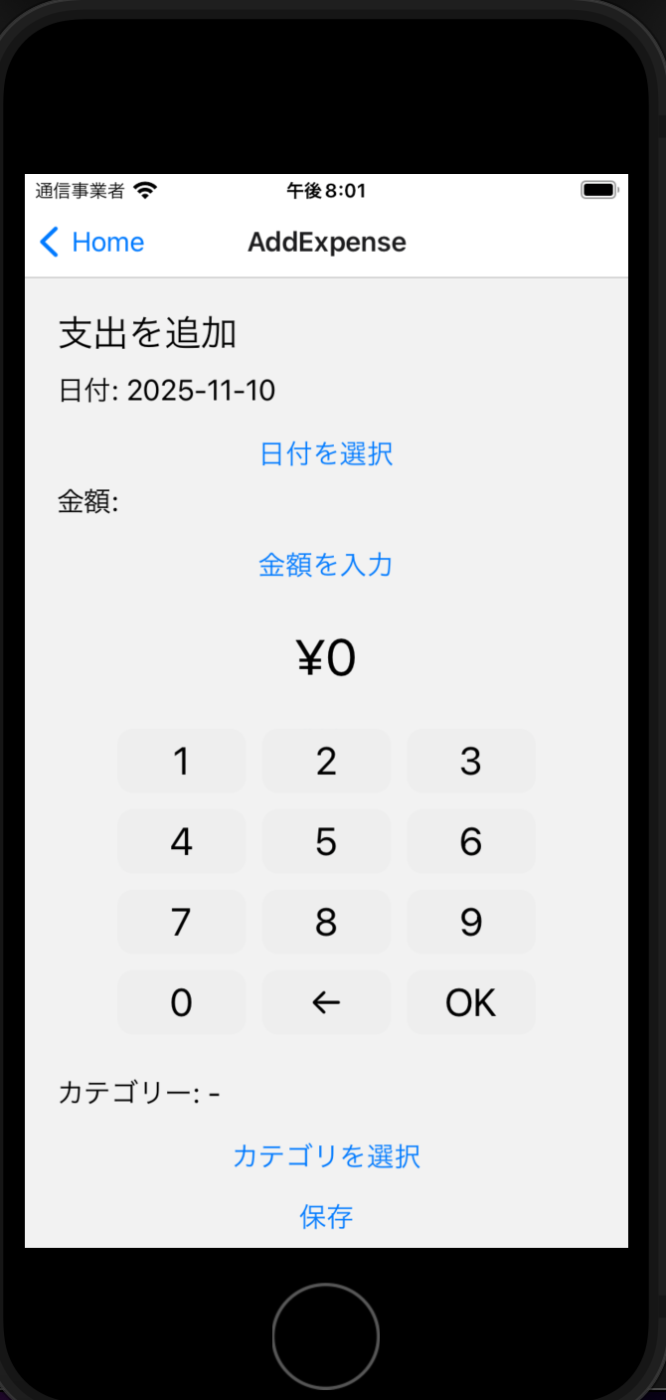 支出の金額、カテゴリ、年月日を登録する際の入力機能を改善する。