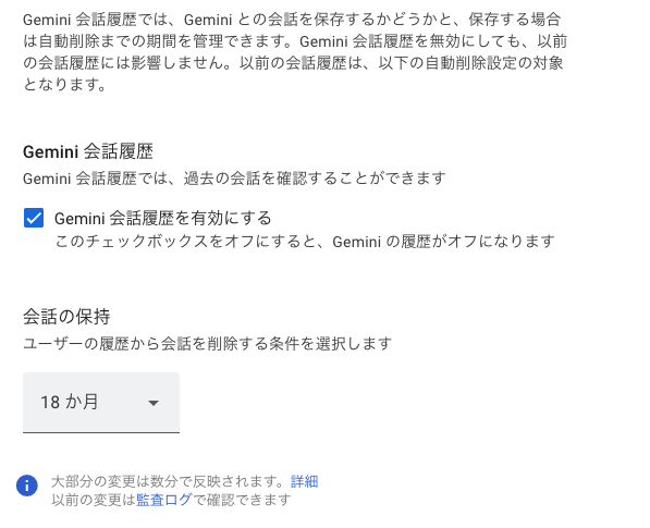 - 「Gemini削除部門」のような部門を作成して、その部門だけ「会話履歴を有効にする」を外して、「会話の保持」期間を最短の3ヶ月にする。