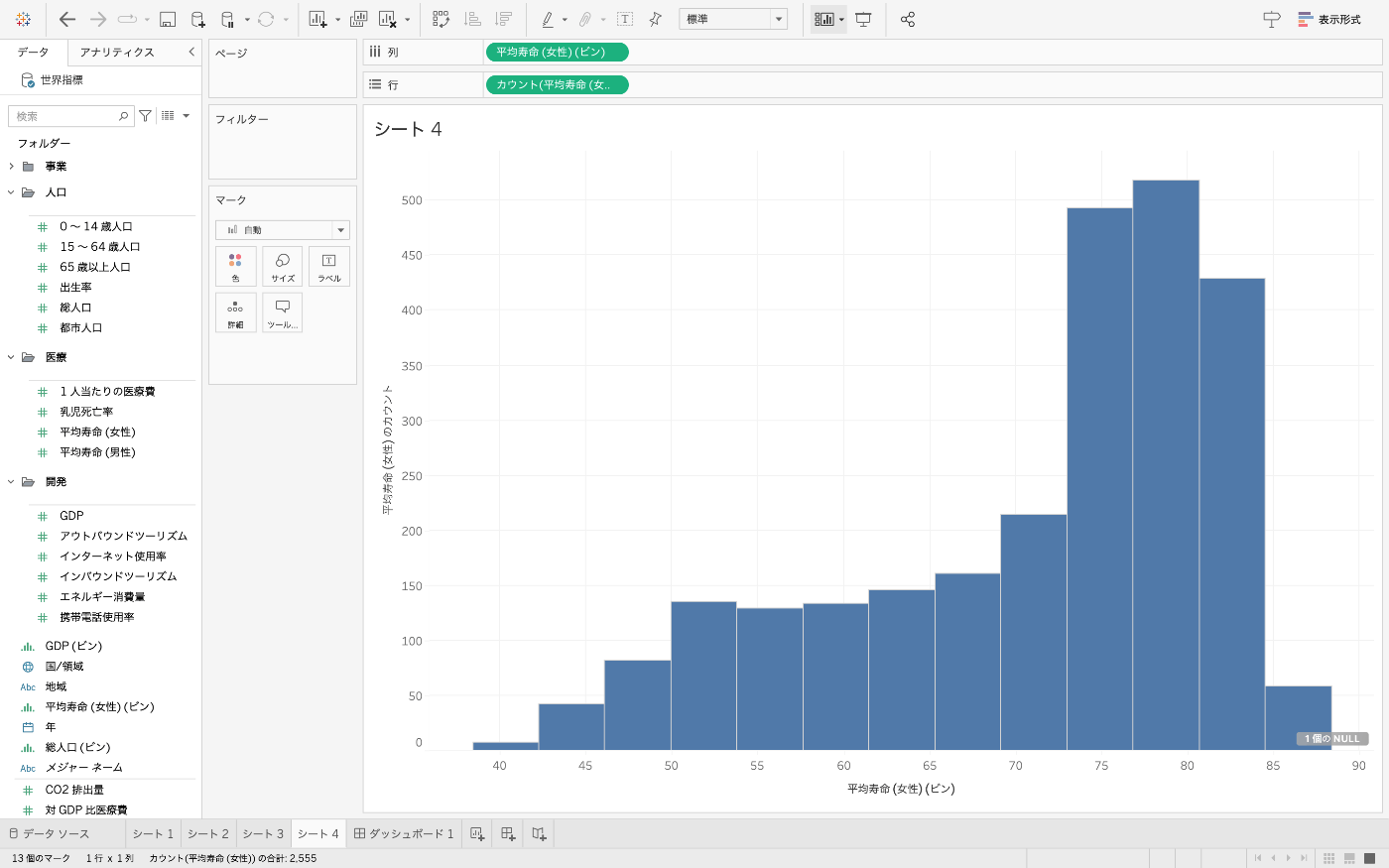 "データに接続"で読み込むファイルを指定。今回はプリセットでダウンロードされている「世界指標」を選択します。