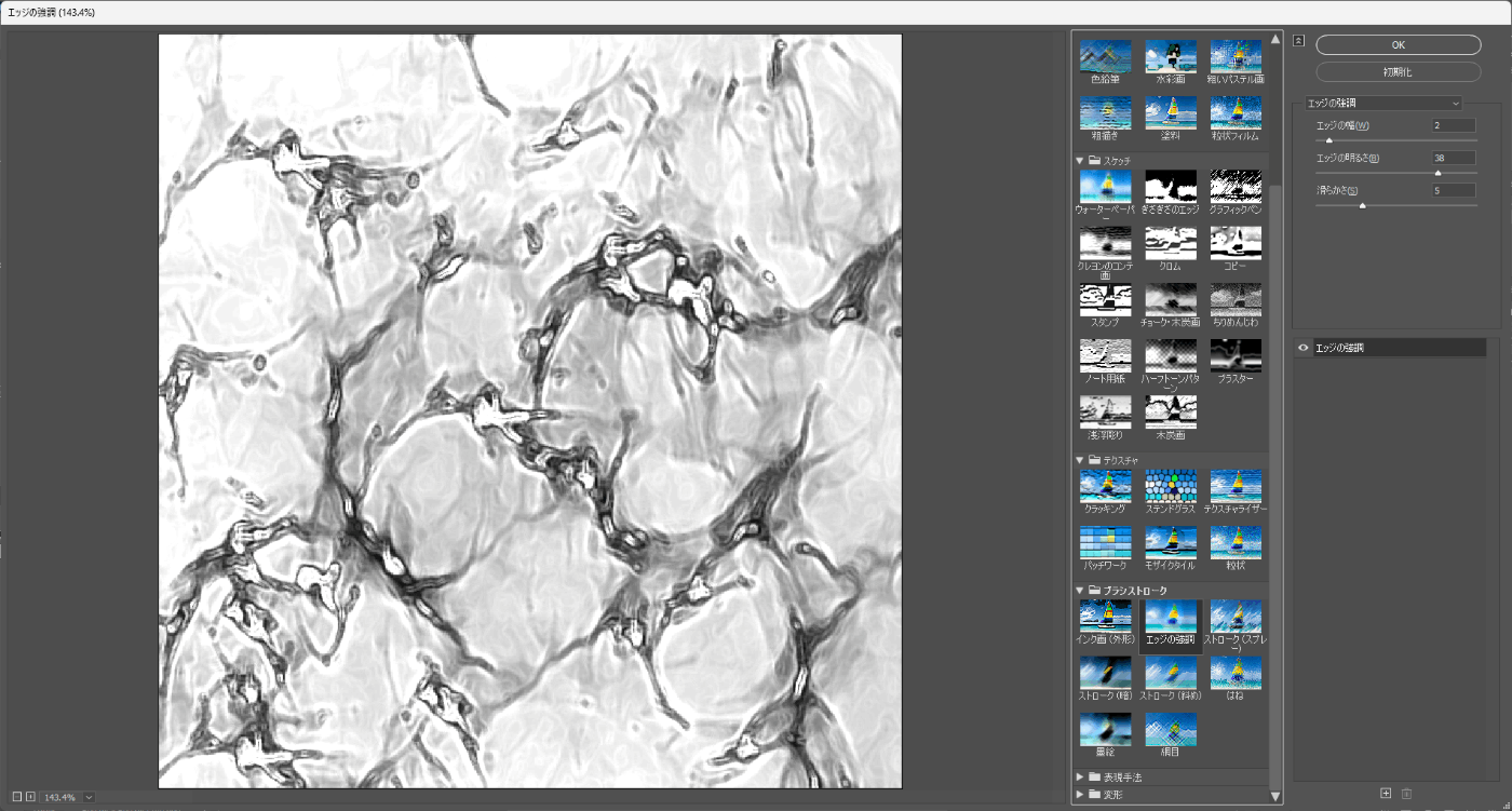 明るさが大きく変化する部分を検出し、各カラーチャンネルで等高線のような細いラインを作成します。