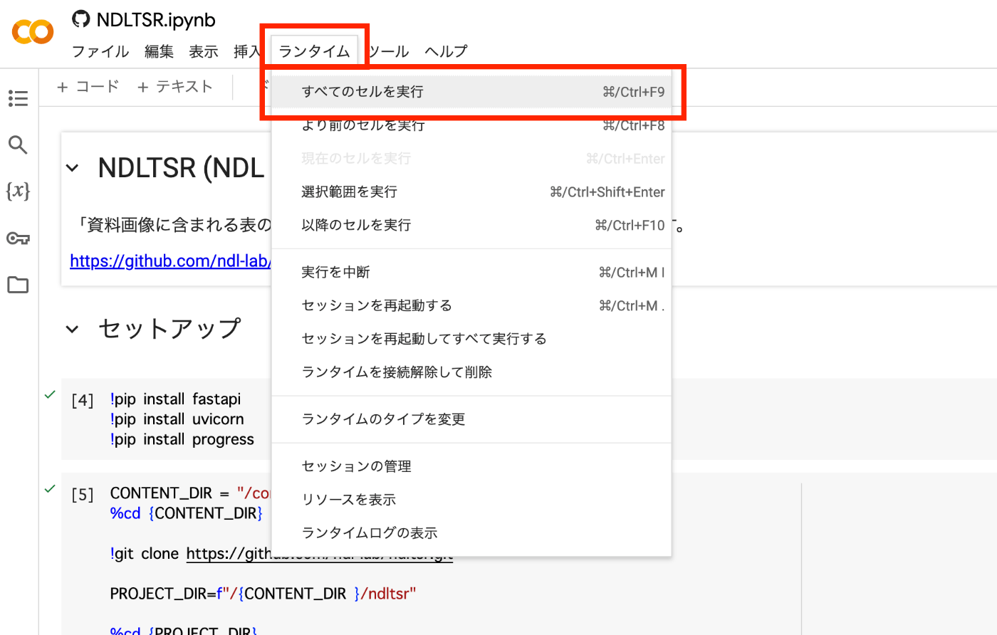 以下のように、「ランタイム」 > 「すべてのセルを実行」 からお試しいただけます。