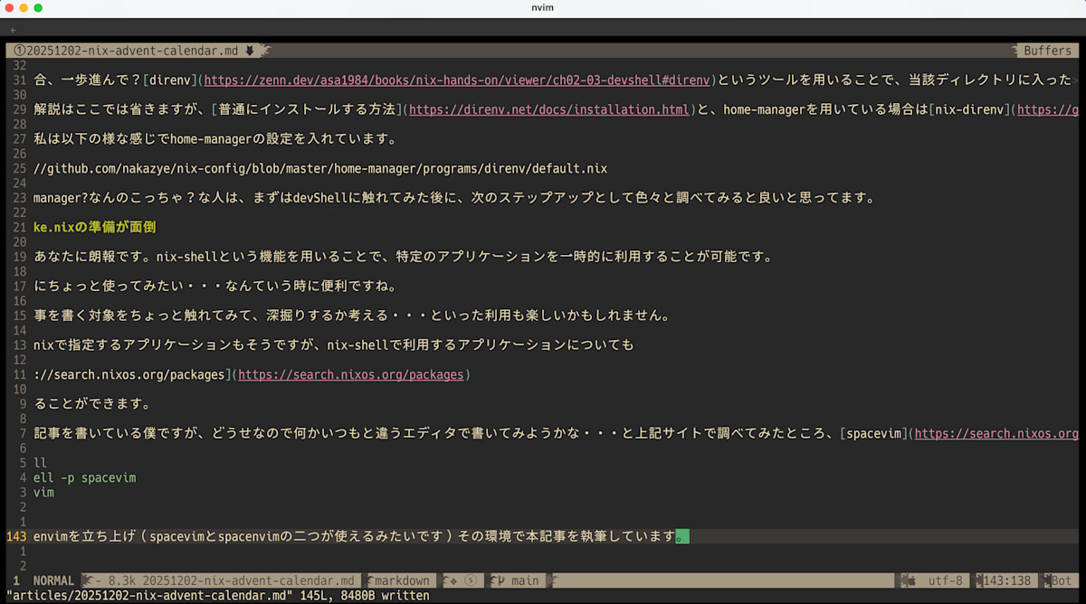でspacenvimを立ち上げ(spacevimとspacenvimの二つが使えるみたいです)その環境で本記事を執筆しています。