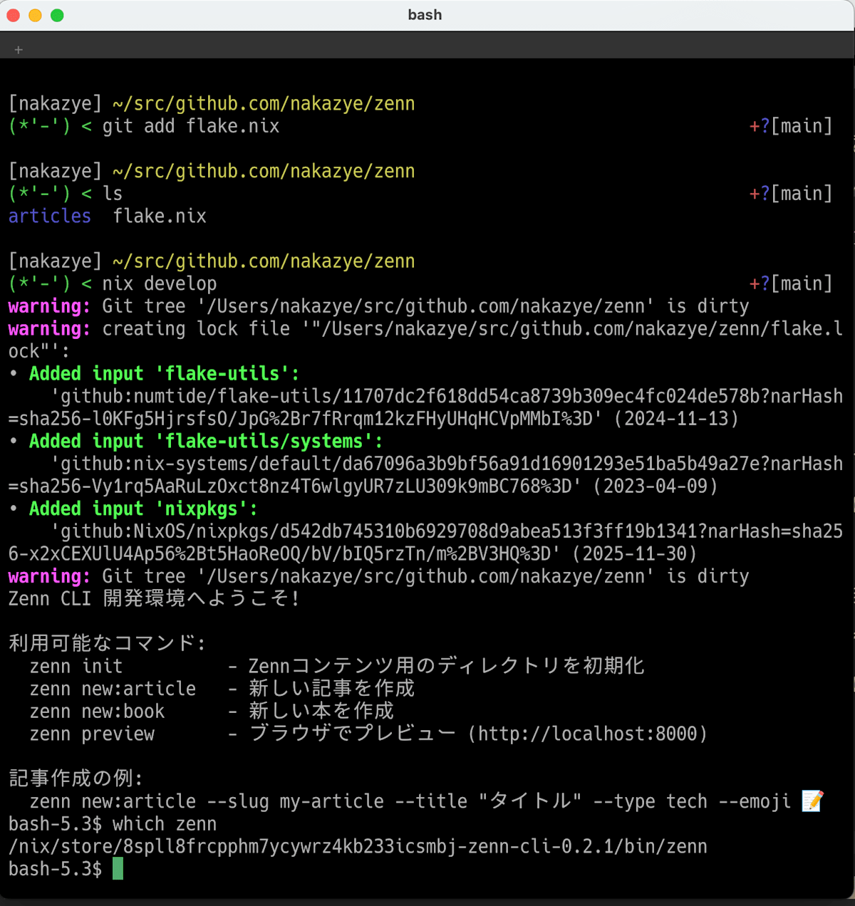 - zenn-cliを導入する為の設定を作成し、devShellと呼ばれる機能を使って読み込む