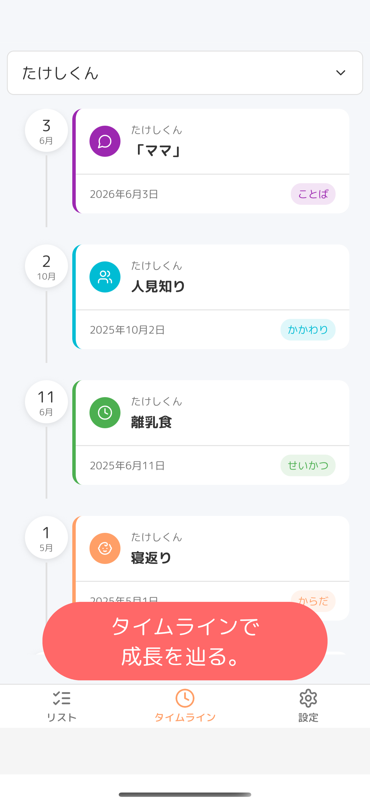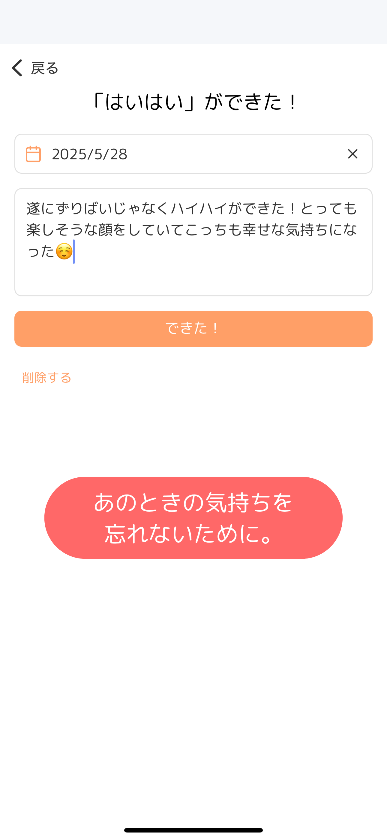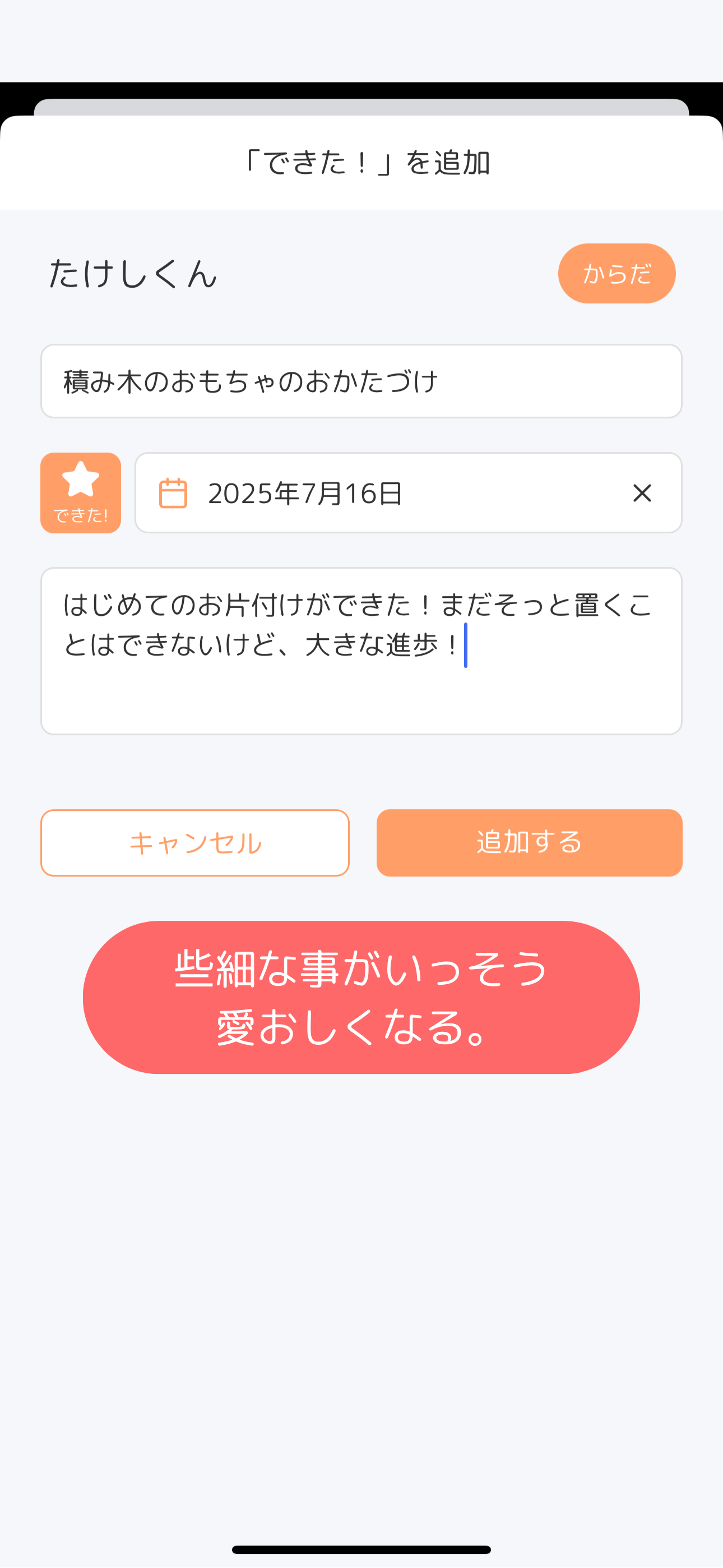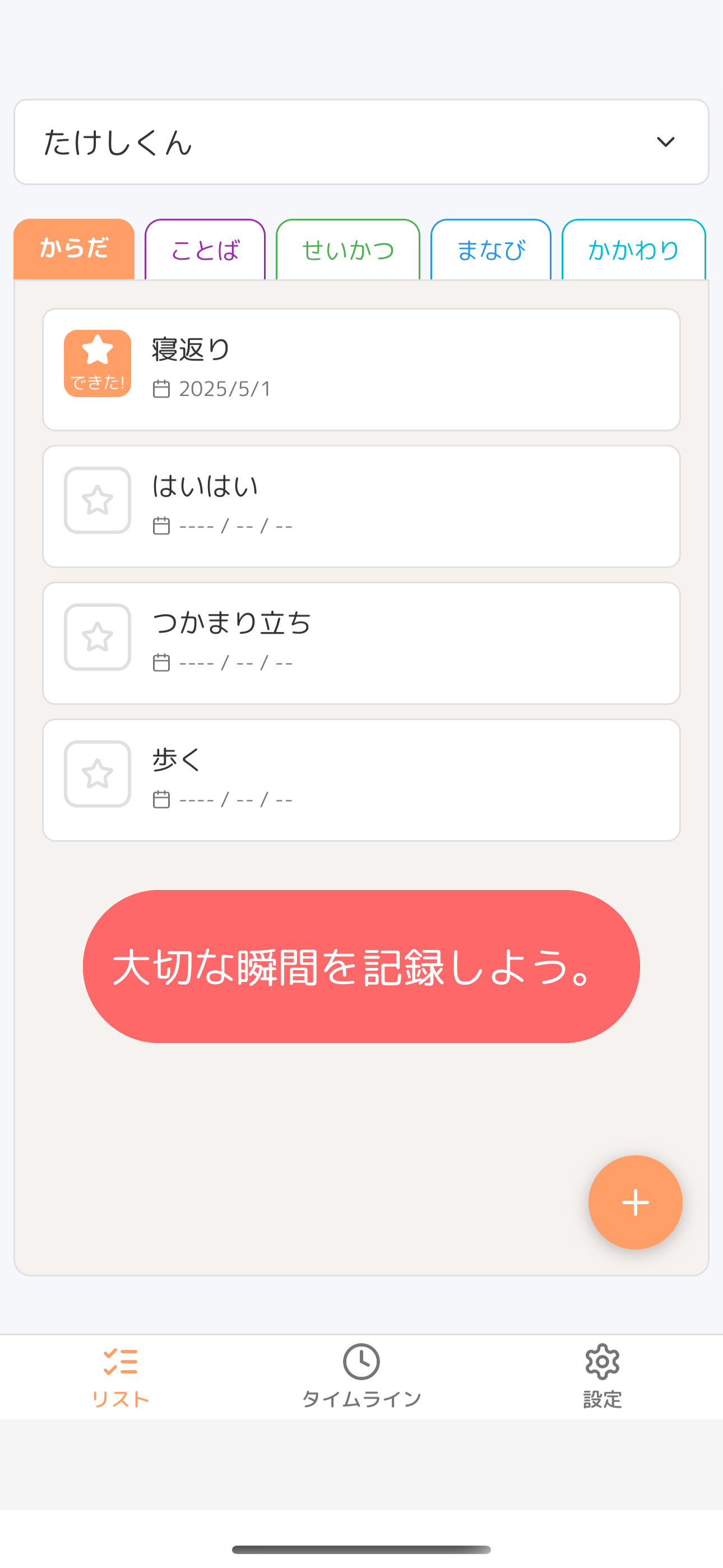 ざっくり言うと、子どもの初めてできたあらゆることを簡単に記録しておけるアプリです。初めての「はいはい」「おすわり」「『パパ・ママ』」「お着替え」...いつできたか覚えておきたいけど忘れちゃって悲しくなることが多々あったので、メモしておけるように自分で作りました。