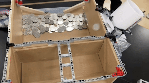 アクリル板でタワーのメダルが溢れないようにし、メダルを木材で真ん中に集めた上でトレーで回収しています。