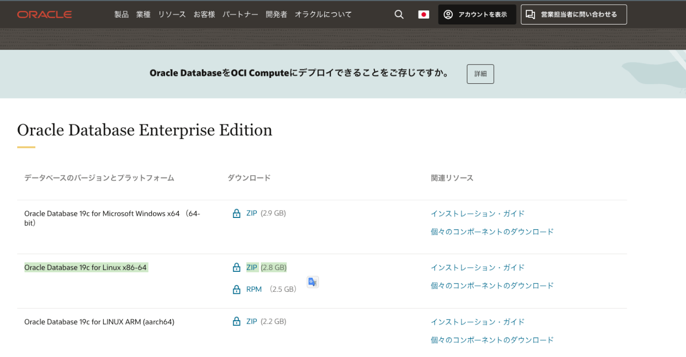 ・オラクル・データベース・ソフトウェアのダウンロード